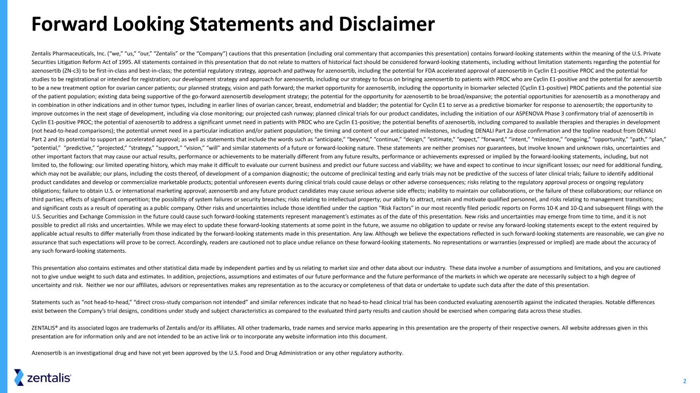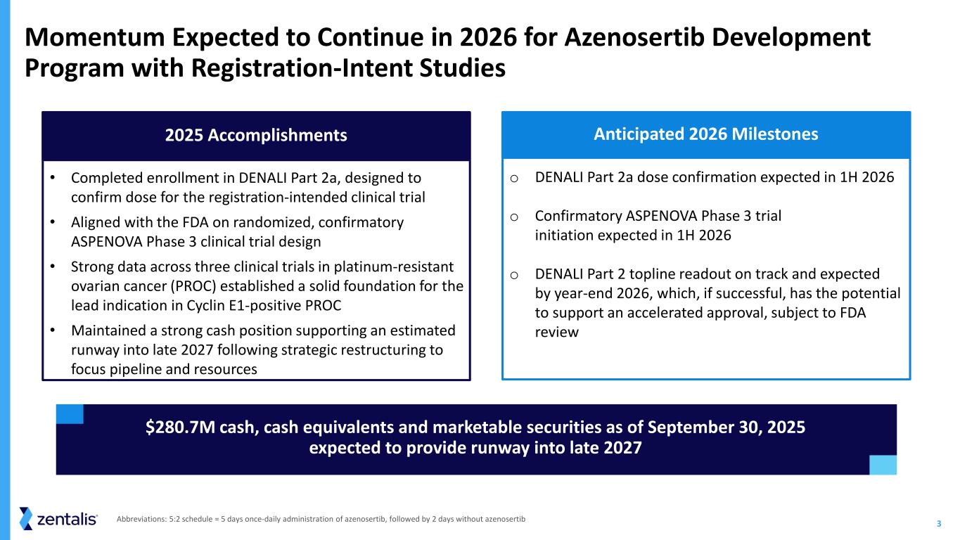 2 Zentalis Pharmaceuticals, Inc. (“we,” “us,” “our,” “Zentalis” or the “Company”) cautions that this presentation (including oral commentary that accompanies this presentation) contains forward-looking statements within the meaning of the U.S. Private Securities Litigation Reform Act of 1995. All statements contained in this presentation that do not relate to matters of historical fact should be considered forward-looking statements, including without limitation statements regarding the potential for azenosertib (ZN-c3) to be first-in-class and best-in-class; the potential regulatory strategy, approach and pathway for azenosertib, including the potential for FDA accelerated approval of azenosertib in Cyclin E1-positive PROC and the potential for studies to be registrational or intended for registration; our development strategy and approach for azenosertib, including our strategy to focus on bringing azenosertib to patients with PROC who are Cyclin E1-positive and the potential for azenosertib to be a new treatment option for ovarian cancer patients; our planned strategy, vision and path forward; the market opportunity for azenosertib, including the opportunity in biomarker selected (Cyclin E1-positive) PROC patients and the potential size of the patient population; existing data being supportive of the go-forward azenosertib development strategy; the potential for the opportunity for azenosertib to be broad/expansive; the potential opportunities for azenosertib as a monotherapy and in combination in other indications and in other tumor types, including in earlier lines of ovarian cancer, breast, endometrial and bladder; the potential for Cyclin E1 to serve as a predictive biomarker for response to azenosertib; the opportunity to improve outcomes in the next stage of development, including via close monitoring; our projected cash runway; planned clinical trials for our product candidates, including the initiation of our ASPENOVA Phase 3 confirmatory trial of azenosertib in Cyclin E1-positive PROC; the potential of azenosertib to address a significant unmet need in patients with PROC who are Cyclin E1-positive; the potential benefits of azenosertib, including compared to available therapies and therapies in development (not head-to-head comparisons); the potential unmet need in a particular indication and/or patient population; the timing and content of our anticipated milestones, including DENALI Part 2a dose confirmation and the topline readout from DENALI Part 2 and its potential to support an accelerated approval; as well as statements that include the words such as “anticipate,” “beyond,” “continue,” “design,” “estimate,” “expect,” “forward,” “intent,” “milestone,” “ongoing,” “opportunity,” “path,” “plan,” “potential,” “predictive,” “projected,” “strategy,” "support," “vision,” “will” and similar statements of a future or forward-looking nature. These statements are neither promises nor guarantees, but involve known and unknown risks, uncertainties and other important factors that may cause our actual results, performance or achievements to be materially different from any future results, performance or achievements expressed or implied by the forward-looking statements, including, but not limited to, the following: our limited operating history, which may make it difficult to evaluate our current business and predict our future success and viability; we have and expect to continue to incur significant losses; our need for additional funding, which may not be available; our plans, including the costs thereof, of development of a companion diagnostic; the outcome of preclinical testing and early trials may not be predictive of the success of later clinical trials; failure to identify additional product candidates and develop or commercialize marketable products; potential unforeseen events during clinical trials could cause delays or other adverse consequences; risks relating to the regulatory approval process or ongoing regulatory obligations; failure to obtain U.S. or international marketing approval; azenosertib and any future product candidates may cause serious adverse side effects; inability to maintain our collaborations, or the failure of these collaborations; our reliance on third parties; effects of significant competition; the possibility of system failures or security breaches; risks relating to intellectual property; our ability to attract, retain and motivate qualified personnel, and risks relating to management transitions; and significant costs as a result of operating as a public company. Other risks and uncertainties include those identified under the caption “Risk Factors” in our most recently filed periodic reports on Forms 10-K and 10-Q and subsequent filings with the U.S. Securities and Exchange Commission in the future could cause such forward-looking statements represent management’s estimates as of the date of this presentation. New risks and uncertainties may emerge from time to time, and it is not possible to predict all risks and uncertainties. While we may elect to update these forward-looking statements at some point in the future, we assume no obligation to update or revise any forward-looking statements except to the extent required by applicable actual results to differ materially from those indicated by the forward-looking statements made in this presentation. Any law. Although we believe the expectations reflected in such forward-looking statements are reasonable, we can give no assurance that such expectations will prove to be correct. Accordingly, readers are cautioned not to place undue reliance on these forward-looking statements. No representations or warranties (expressed or implied) are made about the accuracy of any such forward-looking statements. This presentation also contains estimates and other statistical data made by independent partie