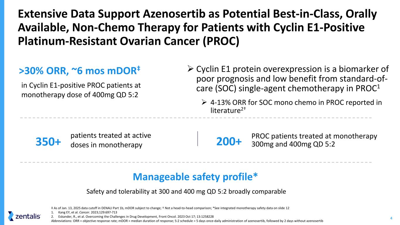 3 Momentum Expected to Continue in 2026 for Azenosertib Development Program with Registration-Intent Studies o DENALI Part 2a dose confirmation expected in 1H 2026 o Confirmatory ASPENOVA Phase 3 trial initiation expected in 1H 2026 o DENALI Part 2 topline readout on track and expected by year-end 2026, which, if successful, has the potential to support an accelerated approval, subject to FDA review Anticipated 2026 Milestones Abbreviations: 5:2 schedule = 5 days once-daily administration of azenosertib, followed by 2 days without azenosertib $280.7M cash, cash equivalents and marketable securities as of September 30, 2025 expected to provide runway into late 2027 • Completed enrollment in DENALI Part 2a, designed to confirm dose for the registration-intended clinical trial • Aligned with the FDA on randomized, confirmatory ASPENOVA Phase 3 clinical trial design • Strong data across three clinical trials in platinum-resistant ovarian cancer (PROC) established a solid foundation for the lead indication in Cyclin E1-positive PROC • Maintained a strong cash position supporting an estimated runway into late 2027 following strategic restructuring to focus pipeline and resources 2025 Accomplishments