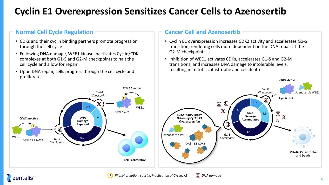 4 Extensive Data Support Azenosertib as Potential Best-in-Class, Orally Available, Non-Chemo Therapy for Patients with Cyclin E1-Positive Platinum-Resistant Ovarian Cancer (PROC) >30% ORR, ~6 mos mDOR‡ ‡ As of Jan. 13, 2025 data cutoff in DENALI Part 1b, mDOR subject to change; † Not a head-to-head comparison; *See integrated monotherapy safety data on slide 12 1. Kang EY, et al. Cancer. 2023;129:697-713 2. Eskander, R., et al. Overcoming the Challenges in Drug Development, Front Oncol. 2023 Oct 17; 13:1258228 Abbreviations: ORR = objective response rate; mDOR = median duration of response; 5:2 schedule = 5 days once-daily administration of azenosertib, followed by 2 days without azenosertib in Cyclin E1-positive PROC patients at monotherapy dose of 400mg QD 5:2 350+ patients treated at active doses in monotherapy 200+ PROC patients treated at monotherapy 300mg and 400mg QD 5:2 Manageable safety profile* Safety and tolerability at 300 and 400 mg QD 5:2 broadly comparable Cyclin E1 protein overexpression is a biomarker of poor prognosis and low benefit from standard-of- care (SOC) single-agent chemotherapy in PROC1 4-13% ORR for SOC mono chemo in PROC reported in literature2†