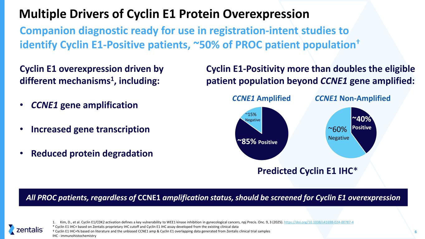 5 • Cyclin E1 overexpression increases CDK2 activity and accelerates G1-S transition, rendering cells more dependent on the DNA repair at the G2-M checkpoint • Inhibition of WEE1 activates CDKs, accelerates G1-S and G2-M transitions, and increases DNA damage to intolerable levels, resulting in mitotic catastrophe and cell death • CDKs and their cyclin binding partners promote progression through the cell cycle • Following DNA damage, WEE1 kinase inactivates Cyclin/CDK complexes at both G1-S and G2-M checkpoints to halt the cell cycle and allow for repair • Upon DNA repair, cells progress through the cell cycle and proliferate Cyclin E1 Overexpression Sensitizes Cancer Cells to Azenosertib Phosphorylation, causing inactivation of Cyclin1/2 DNA damageP G1 S G2 MDNA Damage Repaired CDK2 Inactive CDK2Cyclin E1 WEE1 P CDK1 Inactive WEE1 Cell Proliferation P Normal Cell Cycle Regulation Cancer Cell and Azenosertib Mitotic Catastrophe and Death G2-M Checkpoint DNA Damage Accumulates CDK2 Highly Active Driven by Cyclin E1 Overexpression Cyclin CDK Azenosertib WEE1 Azenosertib WEE1 CDK1 Active G1-S Checkpoint Cyclin E1 CDK2 G1 S G2 MCyclin CDK G2-M Checkpoint G1-S Checkpoint
