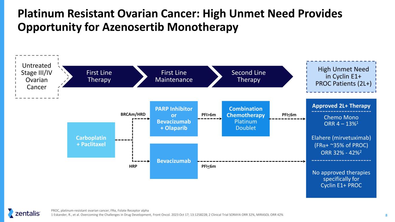 7 Significant Market Opportunity in High Unmet Need Cyclin E1-Positive PROC * Based on 2024 annual estimates in US and EU4 (France, Germany, Italy, Spain) + UK 1. Abbvie Q2 2025 Earnings: https://news.abbvie.com/2025-07-31-AbbVie-Reports-Second-Quarter-2025-Financial-Results 2. NAKAYAMA, K. et al. Int. J. Oncol. 48, 506–516 (2015); Aziz, D. et al. J. Pathol.: Clin. Res. 8, 355–370 (2022); Lotan, Y. et al. Eur Urol 64, 465–471 (2013). 3. Based on internal data No approved treatment option specifically for this biomarker selected PROC population ~21,500 Cyclin E1-Positive PROC patients* (~50% of PROC population) Elahere (mirvetuximab soravtansine) approved for biomarker selected FRα+ PROC population; total sales in 1H 2025 were $338 million1 Underscores demand for biomarker-directed therapies for PROC patients Additional opportunities in earlier lines of ovarian cancer and other tumor types with Cyclin E1 protein overexpression, including breast, endometrial, bladder2 3 PROC FRα+ ~35% Overlap3 ~20% Cyclin E1-Positive ~50%