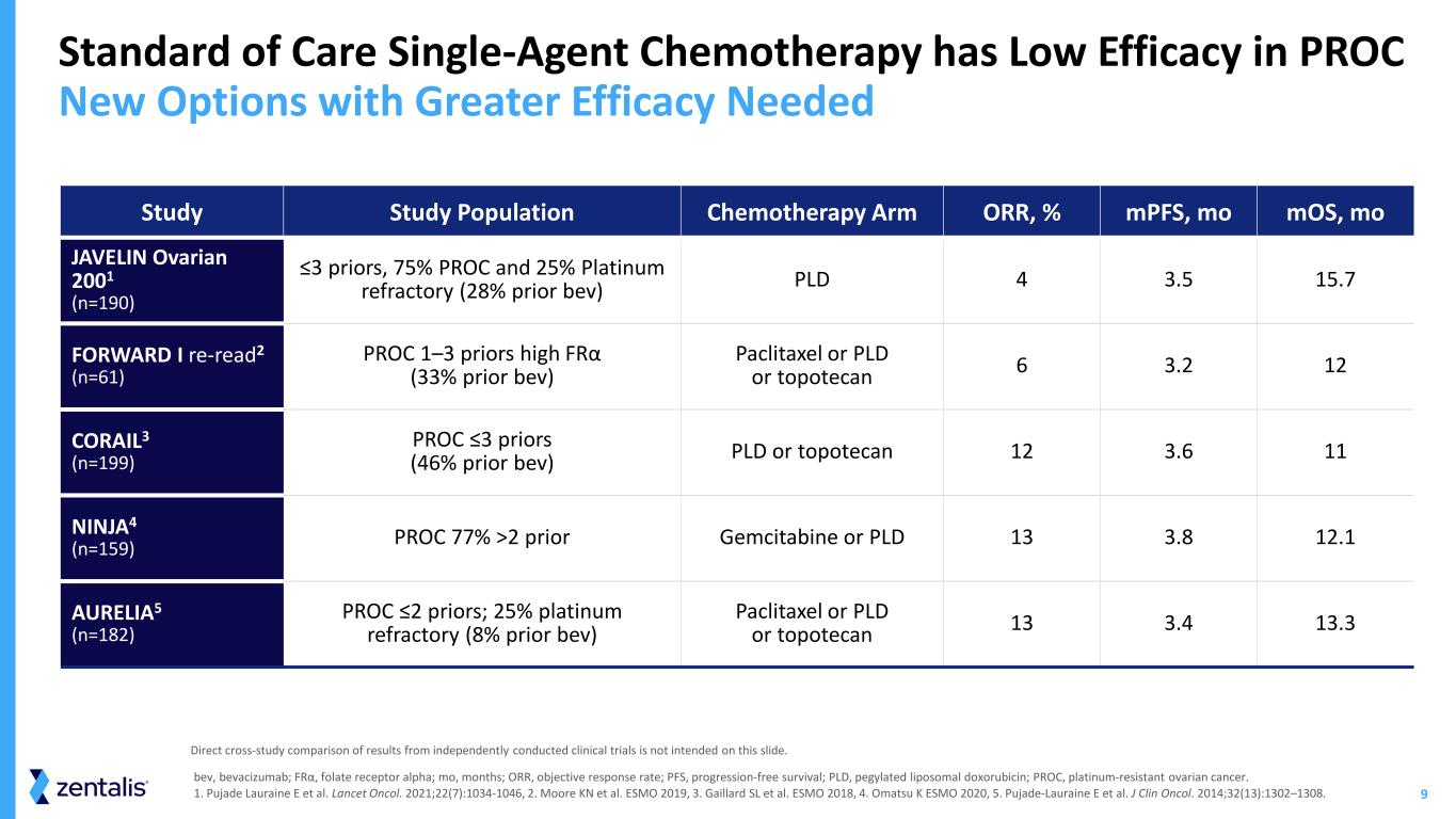 8 PARP Inhibitor or Bevacizumab + Olaparib Bevacizumab Combination Chemotherapy Platinum Doublet HRP PFI>6m PFI<6m PFI<6m Carboplatin + Paclitaxel High Unmet Need in Cyclin E1+ PROC Patients (2L+) Approved 2L+ Therapy Chemo Mono ORR 4 – 13%1 Elahere (mirvetuximab) (FRα+ ~35% of PROC) ORR 32% - 42%2 No approved therapies specifically for Cyclin E1+ PROC Platinum Resistant Ovarian Cancer: High Unmet Need Provides Opportunity for Azenosertib Monotherapy First Line Maintenance Second Line Therapy First Line Therapy BRCAm/HRD Untreated Stage III/IV Ovarian Cancer PROC, platinum-resistant ovarian cancer; FRα, Folate Receptor alpha 1 Eskander, R., et al. Overcoming the Challenges in Drug Development, Front Oncol. 2023 Oct 17; 13:1258228; 2 Clinical Trial SORAYA ORR 32%, MIRASOL ORR 42%