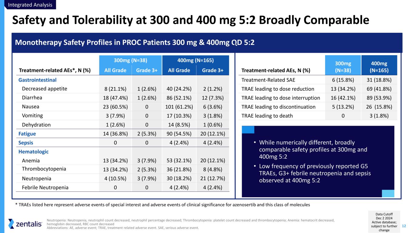 11 Integrated Safety Analysis in All Patients Total Daily Dose ≥300mg (N=356) Neutropenia: Neutropenia, neutrophil count decreased, neutrophil percentage decreased; Thrombocytopenia: platelet count decreased and thrombocytopenia; Anemia: haematocrit decreased, haemoglobin decreased, RBC count decreased Abbreviations: AE, adverse event; TRAE, treatment related adverse event. SAE, serious adverse event. Monotherapy Safety Profiles in 001, MAMMOTH, DENALI Treatment Related AEs, N (%) TRAE leading to dose reduction 145 (40.7) TRAE leading to dose interruption 163 (45.8) TRAE leading to discontinuation 38 (10.7) TRAE leading to death 4 (1.1) Treatment related SAE 52 (14.6) Treatment Related AEs*, N (%) All Grade Grade 3+ Gastrointestinal Decreased appetite 93 (26.1) 6 (1.7) Diarrhea 181 (50.8) 26 (7.3) Nausea 218 (61.2) 13 (3.7) Vomiting 63 (17.7) 5 (1.4) Dehydration 33 (9.3) 2 (0.6) Hematologic Anemia 113 (31.7) 42 (11.8) Thrombocytopenia 108 (30.3) 39 (11.0) Neutropenia 57 (16.0) 44 (12.4) Febrile Neutropenia 6 (1.7) 6 (1.7) Pancytopenia 2 (0.6) 2 (0.6) Fatigue 191 (53.7) 44 (12.4) Sepsis 4 (1.1) 4 (1.1) • Well characterized, manageable safety profile in relatively large sample size • All Grade 5 TRAEs previously reported * TRAEs listed here represent adverse events of special interest and adverse events of clinical significance for azenosertib and this class of molecules Data Cutoff Dec 2 2024 Active database; subject to further change Integrated Analysis