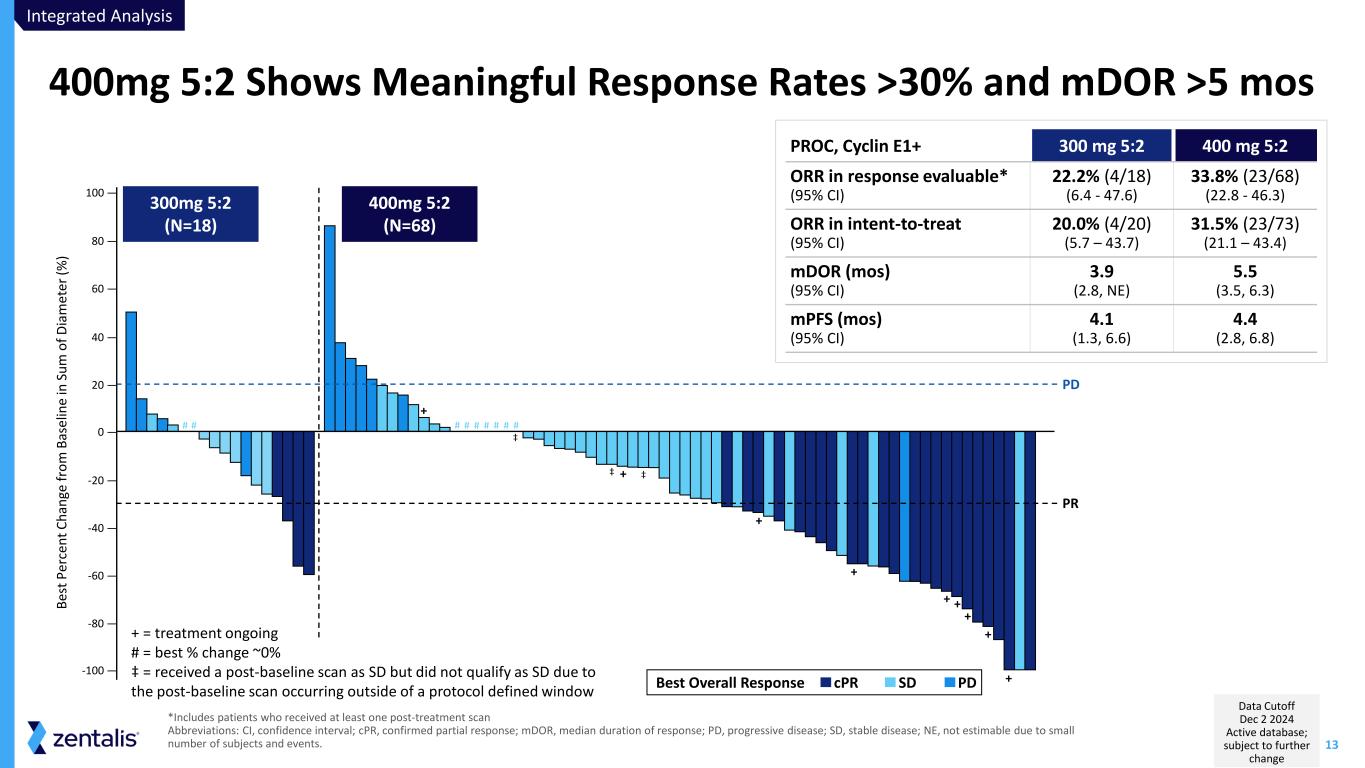 12 Safety and Tolerability at 300 and 400 mg 5:2 Broadly Comparable Neutropenia: Neutropenia, neutrophil count decreased, neutrophil percentage decreased; Thrombocytopenia: platelet count decreased and thrombocytopenia; Anemia: hematocrit decreased, hemoglobin decreased, RBC count decreased Abbreviations: AE, adverse event; TRAE, treatment related adverse event. SAE, serious adverse event. 300mg (N=38) 400mg (N=165) Treatment-related AEs*, N (%) All Grade Grade 3+ All Grade Grade 3+ Gastrointestinal Decreased appetite 8 (21.1%) 1 (2.6%) 40 (24.2%) 2 (1.2%) Diarrhea 18 (47.4%) 1 (2.6%) 86 (52.1%) 12 (7.3%) Nausea 23 (60.5%) 0 101 (61.2%) 6 (3.6%) Vomiting 3 (7.9%) 0 17 (10.3%) 3 (1.8%) Dehydration 1 (2.6%) 0 14 (8.5%) 1 (0.6%) Fatigue 14 (36.8%) 2 (5.3%) 90 (54.5%) 20 (12.1%) Sepsis 0 0 4 (2.4%) 4 (2.4%) Hematologic Anemia 13 (34.2%) 3 (7.9%) 53 (32.1%) 20 (12.1%) Thrombocytopenia 13 (34.2%) 2 (5.3%) 36 (21.8%) 8 (4.8%) Neutropenia 4 (10.5%) 3 (7.9%) 30 (18.2%) 21 (12.7%) Febrile Neutropenia 0 0 4 (2.4%) 4 (2.4%) Monotherapy Safety Profiles in PROC Patients 300 mg & 400mg QD 5:2 Treatment-related AEs, N (%) 300mg (N=38) 400mg (N=165) Treatment-Related SAE 6 (15.8%) 31 (18.8%) TRAE leading to dose reduction 13 (34.2%) 69 (41.8%) TRAE leading to dose interruption 16 (42.1%) 89 (53.9%) TRAE leading to discontinuation 5 (13.2%) 26 (15.8%) TRAE leading to death 0 3 (1.8%) * TRAEs listed here represent adverse events of special interest and adverse events of clinical significance for azenosertib and this class of molecules • While numerically different, broadly comparable safety profiles at 300mg and 400mg 5:2 • Low frequency of previously reported G5 TRAEs, G3+ febrile neutropenia and sepsis observed at 400mg 5:2 Integrated Analysis Data Cutoff Dec 2 2024 Active database; subject to further change