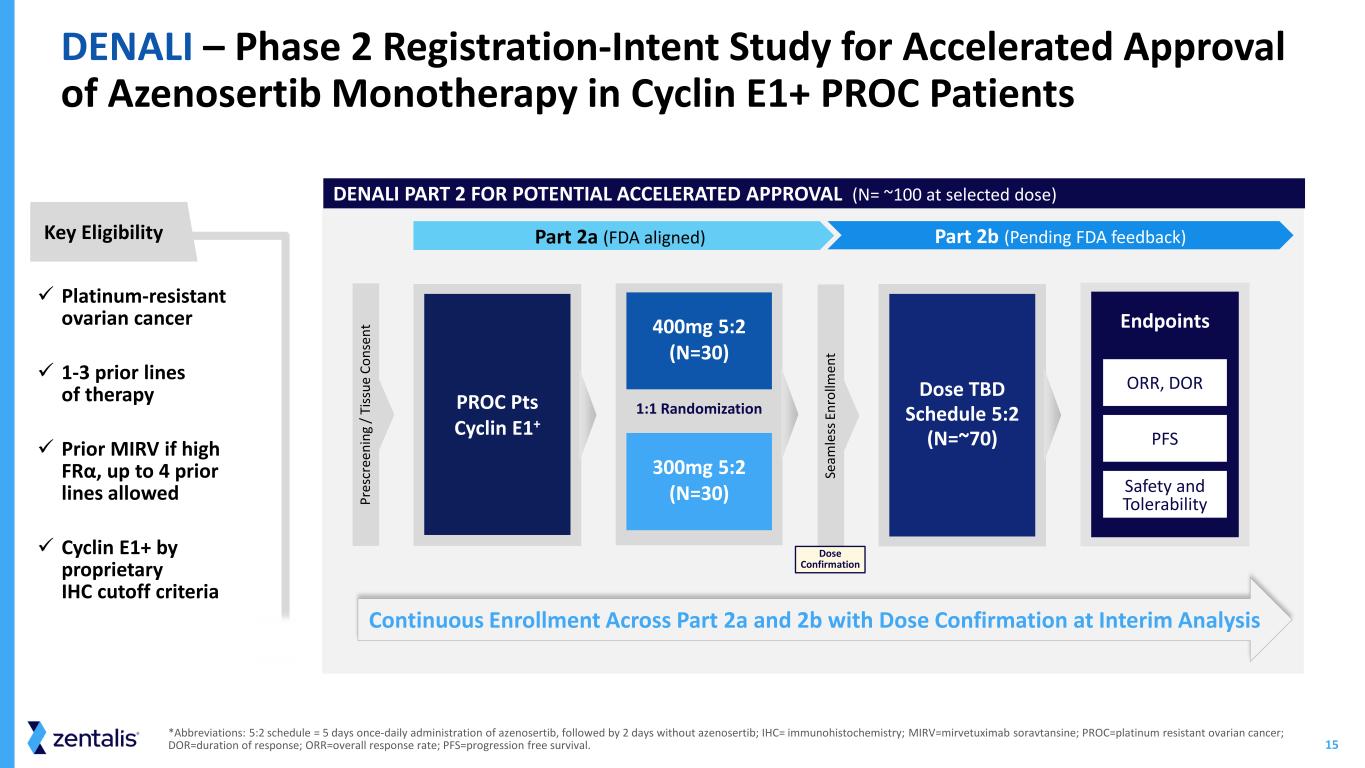 14 Higher Response Rates and Longer PFS with Fewer Prior Lines of Therapy Integrated Analysis Data Cutoff Dec 2 2024 Active database; subject to further change Overall 1-3 PLoT 4+ PLoT ORR in response evaluable* (95% CI) 33.8% (23/68) (22.8 – 46.3) 40.0% (16/40) (24.9 – 56.7) 25.0% (7/28) (10.7 – 44.9) ORR in intent-to-treat (95% CI) 31.5% (23/73) (21.1 – 43.4) 36.4% (16/44) (22.4 – 52.2) 24.1% (7/29) (10.3 – 43.5) mDOR (mos) (95% CI) 5.5 (3.5 – 6.3) 5.5 (3.5 – 6.3) NE (2.7 – NE) mPFS (mos) (95% CI) 4.4 (2.8 – 6.8) 5.4 (2.8 – 6.8) 4.1 (2.6 – 8.5) *Includes patients who received at least one post-treatment scan Abbreviations: CI, confidence interval; mDOR, median duration of response; mPFS, median progression free survival; NE, not estimable due to small number of subjects and events; PLoT, prior line of therapy Subgroup Analysis by Prior Line of Therapy Cyclin E1+ PROC patients treated at 400mg QD 5:2 in 001, MAMMOTH and DENALI