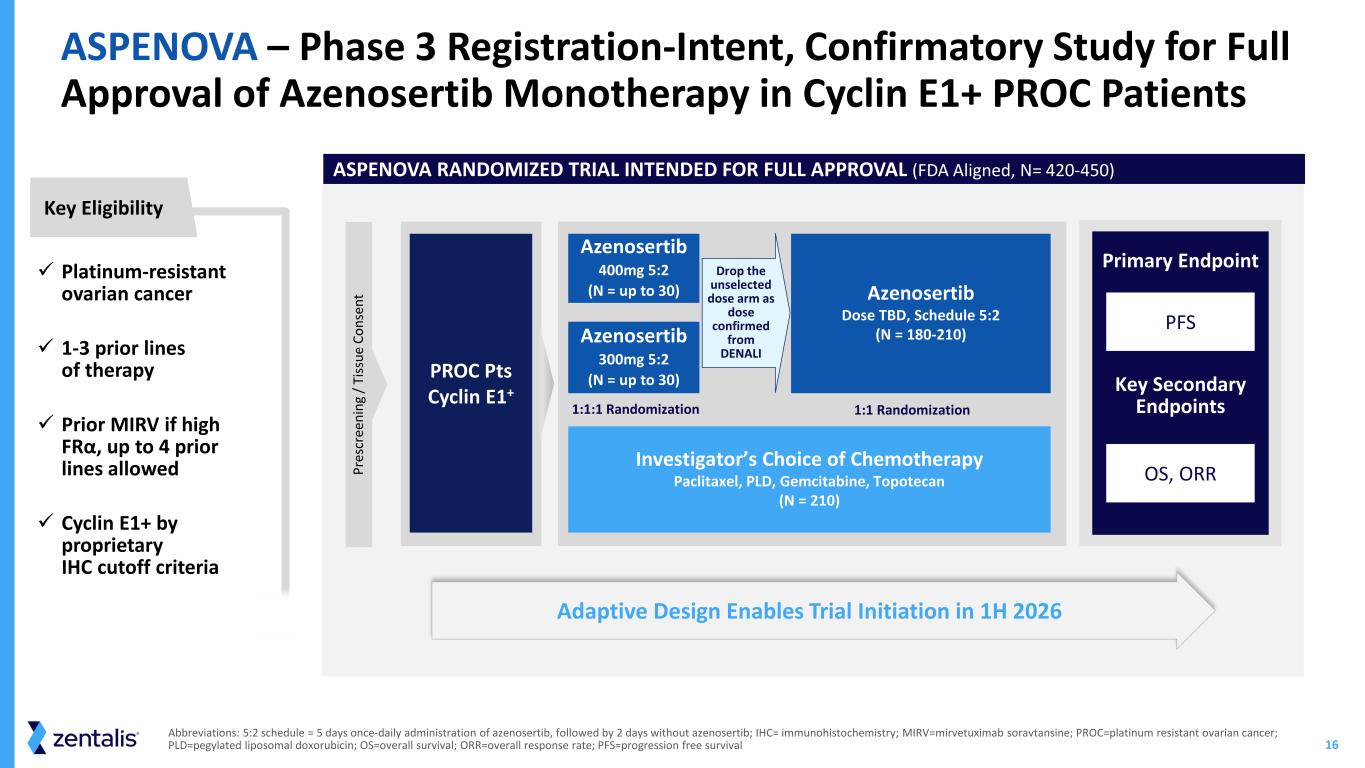 15 *Abbreviations: 5:2 schedule = 5 days once-daily administration of azenosertib, followed by 2 days without azenosertib; IHC= immunohistochemistry; MIRV=mirvetuximab soravtansine; PROC=platinum resistant ovarian cancer; DOR=duration of response; ORR=overall response rate; PFS=progression free survival. DENALI PART 2 FOR POTENTIAL ACCELERATED APPROVAL (N= ~100 at selected dose) Platinum-resistant ovarian cancer 1-3 prior lines of therapy Prior MIRV if high FRα, up to 4 prior lines allowed Cyclin E1+ by proprietary IHC cutoff criteria Key Eligibility DENALI – Phase 2 Registration-Intent Study for Accelerated Approval of Azenosertib Monotherapy in Cyclin E1+ PROC Patients Part 2a (FDA aligned) Part 2b (Pending FDA feedback) Continuous Enrollment Across Part 2a and 2b with Dose Confirmation at Interim Analysis PROC Pts Cyclin E1+ 400mg 5:2 (N=30) 300mg 5:2 (N=30) 1:1 Randomization Dose TBD Schedule 5:2 (N=~70) Endpoints PFS Safety and Tolerability ORR, DOR Pr es cr ee ni ng / Ti ss ue C on se nt Se am le ss E nr ol lm en t Dose Confirmation