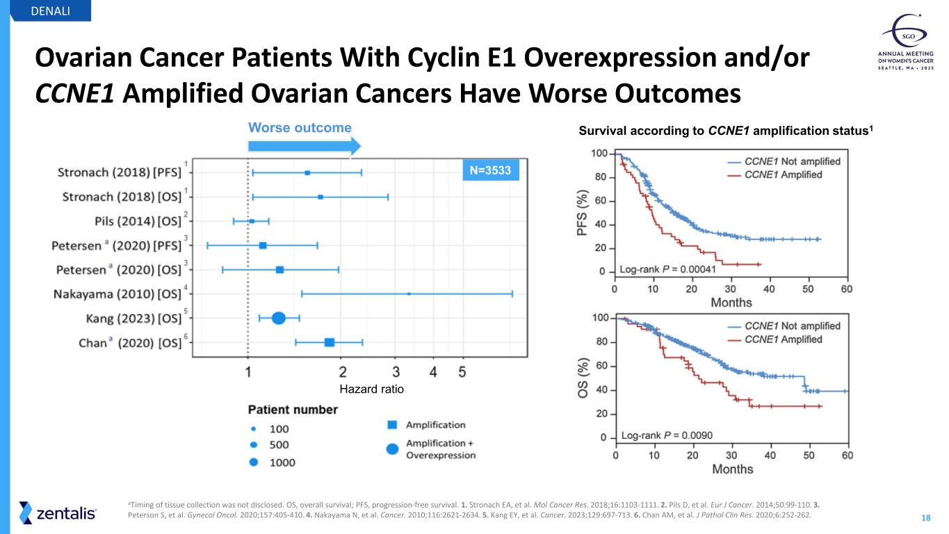 18 Ovarian Cancer Patients With Cyclin E1 Overexpression and/or CCNE1 Amplified Ovarian Cancers Have Worse Outcomes DENALI Survival according to CCNE1 amplification status1 aTiming of tissue collection was not disclosed. OS, overall survival; PFS, progression-free survival. 1. Stronach EA, et al. Mol Cancer Res. 2018;16:1103-1111. 2. Pils D, et al. Eur J Cancer. 2014;50:99-110. 3. Peterson S, et al. Gynecol Oncol. 2020;157:405-410. 4. Nakayama N, et al. Cancer. 2010;116:2621-2634. 5. Kang EY, et al. Cancer. 2023;129:697-713. 6. Chan AM, et al. J Pathol Clin Res. 2020;6:252-262. Hazard ratio N=3533 Worse outcome