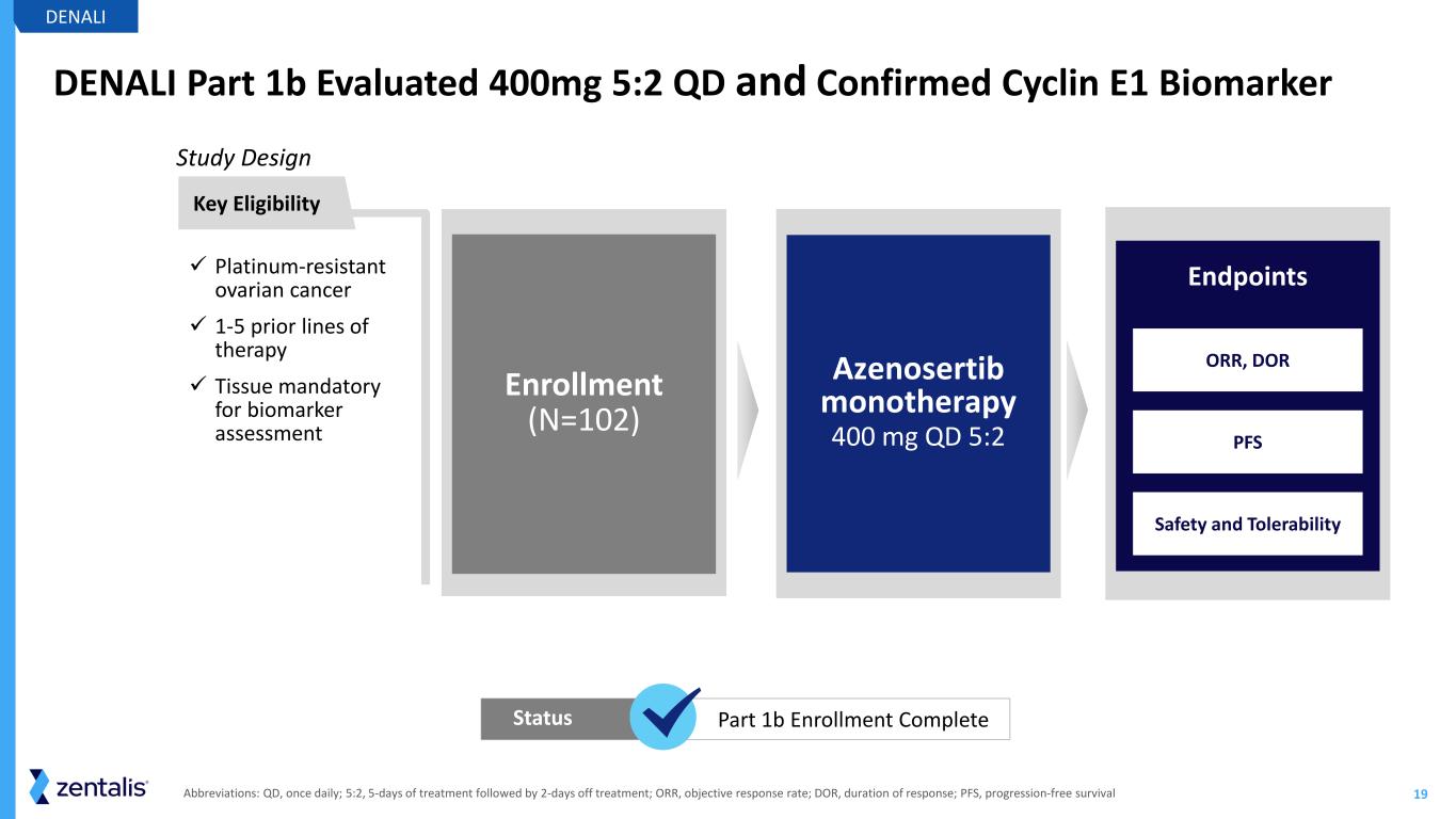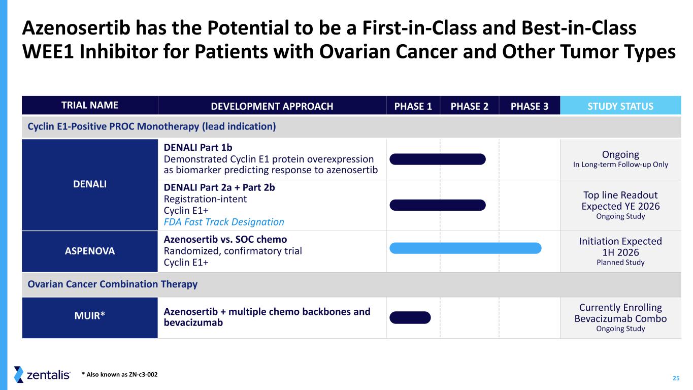 24 Registration-Intent DENALI Part 2 Topline Data Anticipated by YE2026 Cyclin E1+ / overexpression by IHC represents ~ 50%c of PROC • Cyclin E1+ IHC more than doubles the eligible patient population beyond CCNE1 amp Azenosertib demonstrates ORR of ~35% in evaluablea patients with Cyclin E1+ PROC • Median duration of response is 6.3 monthsb Cyclin E1 by IHC is a predictive biomarker for response to azenosertib Manageable safety profile • GI toxicity (nausea, diarrhea) and fatigue are the most common TRAEs; although less common, hematological toxicities require close monitoring during treatment with azenosertib Azenosertib data support further development in Cyclin E1+ PROC in Part 2 of the ongoing DENALI study DENALI aIncludes patients who received at least one post treatment scan as of the January 13, 2025 data cut off; bmDOR is subject to change, there are 4 ongoing responders as of the January 13, 2025 data cut off; c Cyclin E1 IHC+ based on Zentalis proprietary IHC cutoff and Cyclin E1 IHC assay developed from the existing clinical data; Cyclin E1 IHC+% based on literature (~20% CCNE1 amplification) and the unbiased CCNE1 amp & Cyclin E1 overlapping data generated from Zentalis clinical trial samples GI, gastrointestinal; mDOR, median duration of response; PROC, platinum-resistant ovarian cancer; TRAE, treatment-related adverse event.