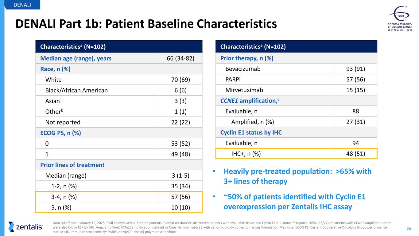 19 Study Design Platinum-resistant ovarian cancer 1-5 prior lines of therapy Tissue mandatory for biomarker assessment Key Eligibility DENALI Part 1b Evaluated 400mg 5:2 QD and Confirmed Cyclin E1 Biomarker DENALI Abbreviations: QD, once daily; 5:2, 5-days of treatment followed by 2-days off treatment; ORR, objective response rate; DOR, duration of response; PFS, progression-free survival Endpoints PFS Safety and Tolerability ORR, DOR Enrollment (N=102) Azenosertib monotherapy 400 mg QD 5:2 Part 1b Enrollment CompleteStatus
