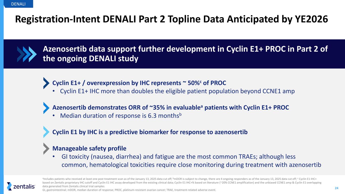 23 DENALI Part 1b: Safety and Tolerability Summary DENALI Data cutoff date: January 13, 2025 aIf a patient had multiple grades of the same adverse event, The worse grade was reported bOne patient had sepsis, and 1 patient had pancytopenia. ALT, alanine aminotransferase; AST, aspartate aminotransferase; TRAE, treatment-related adverse event. 12 11 11 4 7 3 2 3 16 7 3 5 1 0 25 50 75 100 Grade ≥3 Grades 1-2 66 51 15 14 60 15 13 13 12 11 11 12 Total 15 23 % Patients Hematological Thrombocytopenia Anemia Neutropenia Gastrointestinal Nausea Diarrhea Decreased appetite Constipation Dysgeusia Abdominal pain Other Fatigue ALT increased Asthenia Dizziness Headache Hypomagnesemia AST increased Dehydration TRAEs, n (%) Leading to dose reduction 44 (43.1) Leading to dose interruption 59 (57.8) Leading to discontinuation 22 (21.6) Leading to death 2 (2.0)b Serious TRAEs 22 (21.6) 35 29 16 TRAEs occurring in ≥10% of patientsa