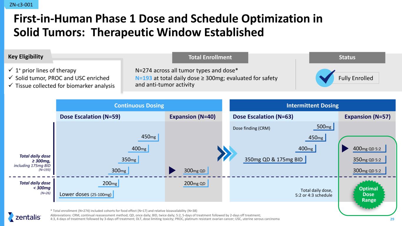 29 Total Enrollment First-in-Human Phase 1 Dose and Schedule Optimization in Solid Tumors: Therapeutic Window Established N=274 across all tumor types and dose* N=193 at total daily dose ≥ 300mg; evaluated for safety and anti-tumor activity ZN-c3-001 * Total enrollment (N=274) included cohorts for food effect (N=17) and relative bioavailability (N=38) Abbreviations: CRM, continual reassessment method; QD, once daily; BID, twice daily; 5:2, 5-days of treatment followed by 2-days off treatment; 4:3, 4-days of treatment followed by 3-days off treatment; DLT, dose limiting toxicity; PROC, platinum resistant ovarian cancer; USC, uterine serous carcinoma Intermittent Dosing Dose finding (CRM) Expansion (N=57)Dose Escalation (N=63) 450mg 500mg 400mg 400mg QD 5:2 350mg QD & 175mg BID 350mg QD 5:2 300mg QD 5:2 Total daily dose, 5:2 or 4:3 schedule Continuous Dosing Dose Escalation (N=59) Expansion (N=40) 450mg 200mg 400mg 350mg Lower doses (25-100mg) 300mg 300mg QD 200mg QD Total daily dose ≥ 300mg, including 175mg BID (N=193) Total daily dose < 300mg (N=26) Key Eligibility Status 1+ prior lines of therapy Solid tumor, PROC and USC enriched Tissue collected for biomarker analysis Fully Enrolled Optimal Dose Range