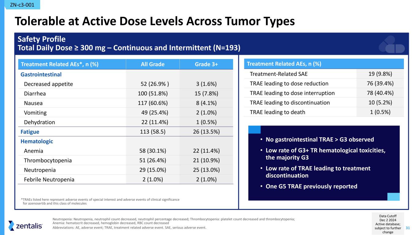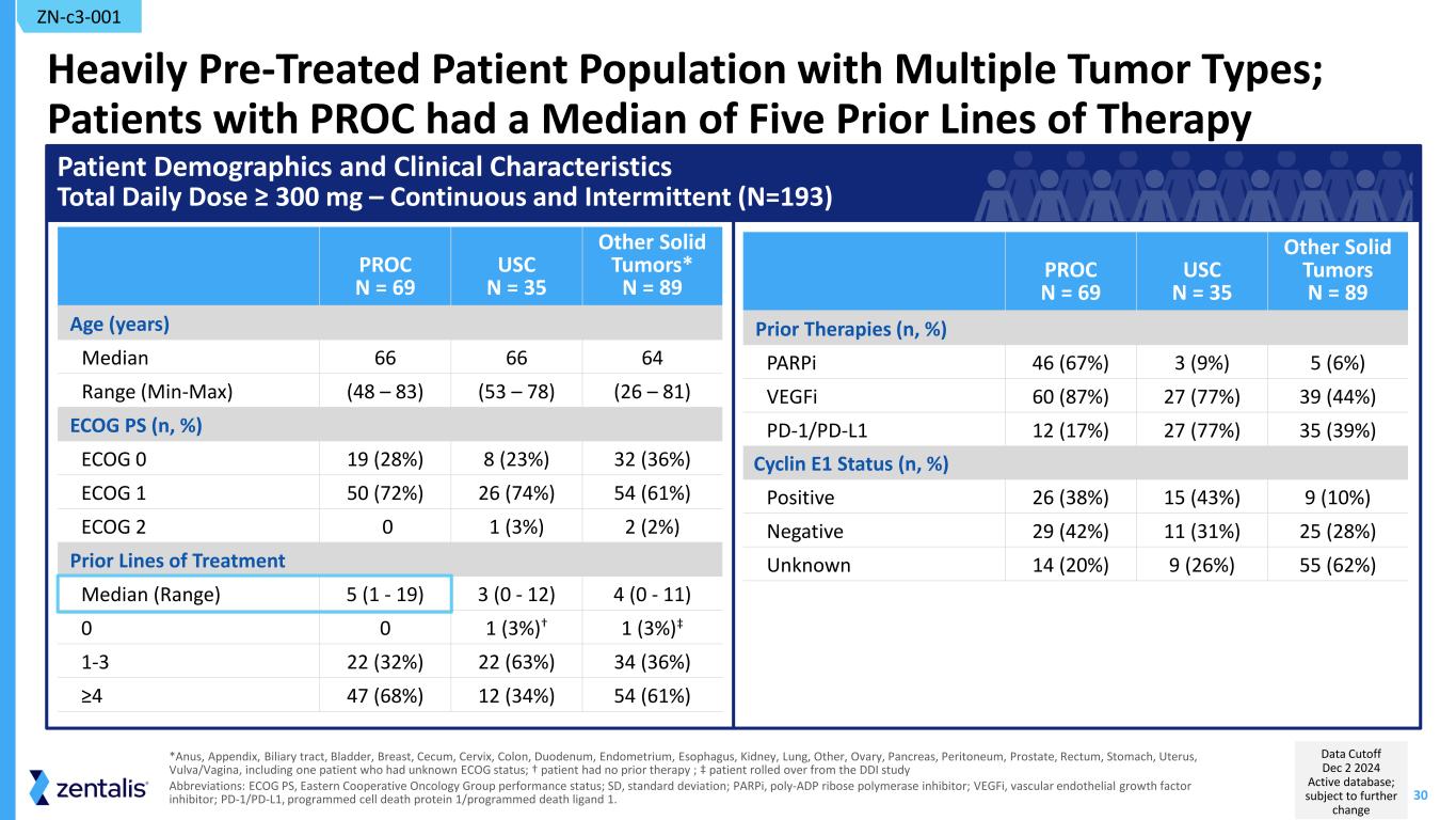 30 Heavily Pre-Treated Patient Population with Multiple Tumor Types; Patients with PROC had a Median of Five Prior Lines of Therapy PROC N = 69 USC N = 35 Other Solid Tumors* N = 89 Age (years) Median 66 66 64 Range (Min-Max) (48 – 83) (53 – 78) (26 – 81) ECOG PS (n, %) ECOG 0 19 (28%) 8 (23%) 32 (36%) ECOG 1 50 (72%) 26 (74%) 54 (61%) ECOG 2 0 1 (3%) 2 (2%) Prior Lines of Treatment Median (Range) 5 (1 - 19) 3 (0 - 12) 4 (0 - 11) 0 0 1 (3%)† 1 (3%)‡ 1-3 22 (32%) 22 (63%) 34 (36%) ≥4 47 (68%) 12 (34%) 54 (61%) *Anus, Appendix, Biliary tract, Bladder, Breast, Cecum, Cervix, Colon, Duodenum, Endometrium, Esophagus, Kidney, Lung, Other, Ovary, Pancreas, Peritoneum, Prostate, Rectum, Stomach, Uterus, Vulva/Vagina, including one patient who had unknown ECOG status; † patient had no prior therapy ; ‡ patient rolled over from the DDI study Abbreviations: ECOG PS, Eastern Cooperative Oncology Group performance status; SD, standard deviation; PARPi, poly-ADP ribose polymerase inhibitor; VEGFi, vascular endothelial growth factor inhibitor; PD-1/PD-L1, programmed cell death protein 1/programmed death ligand 1. Patient Demographics and Clinical Characteristics Total Daily Dose ≥ 300 mg – Continuous and Intermittent (N=193) PROC N = 69 USC N = 35 Other Solid Tumors N = 89 Prior Therapies (n, %) PARPi 46 (67%) 3 (9%) 5 (6%) VEGFi 60 (87%) 27 (77%) 39 (44%) PD-1/PD-L1 12 (17%) 27 (77%) 35 (39%) Cyclin E1 Status (n, %) Positive 26 (38%) 15 (43%) 9 (10%) Negative 29 (42%) 11 (31%) 25 (28%) Unknown 14 (20%) 9 (26%) 55 (62%) ZN-c3-001 Data Cutoff Dec 2 2024 Active database; subject to further change