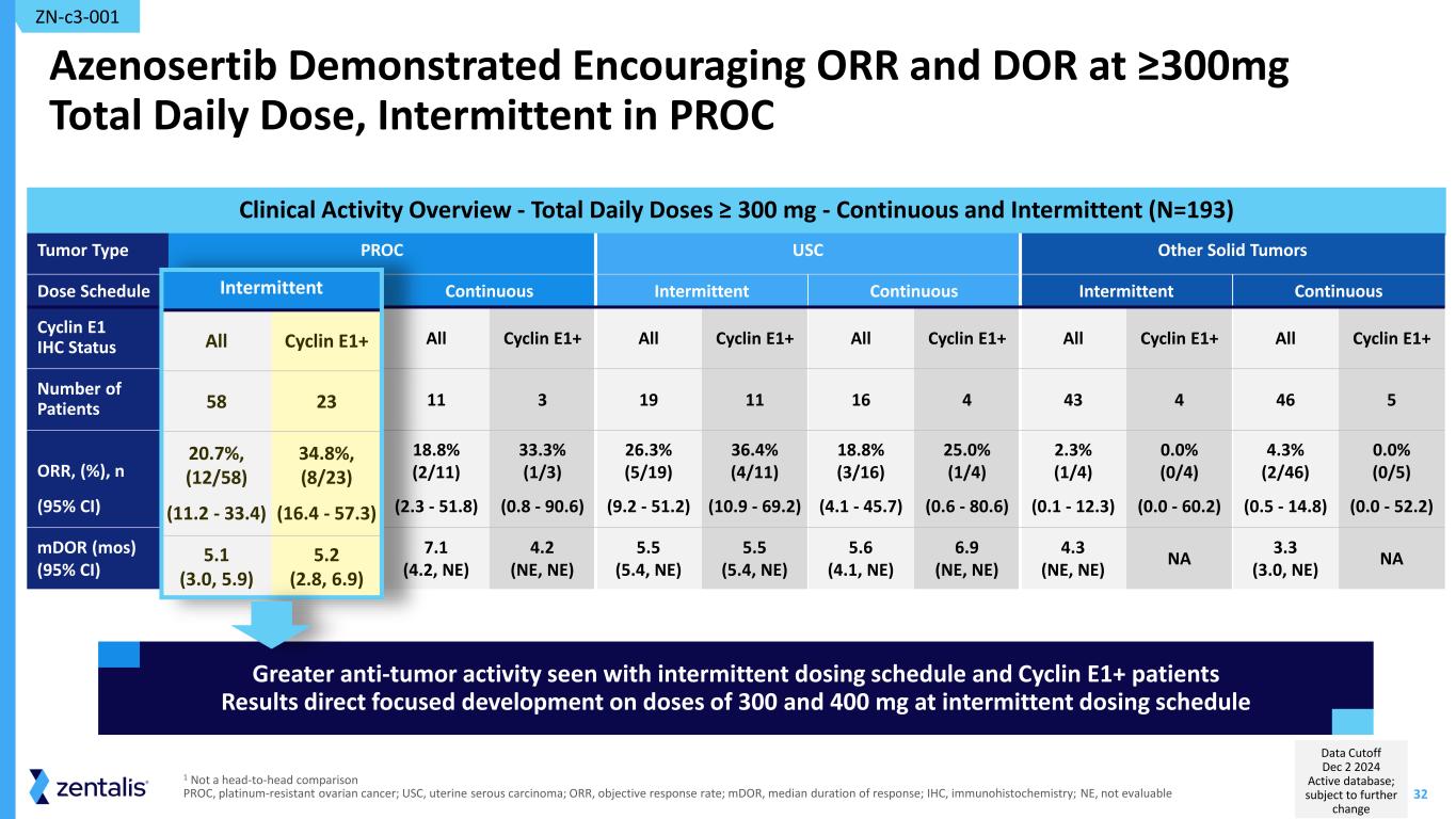 31 Tolerable at Active Dose Levels Across Tumor Types Treatment Related AEs, n (%) Treatment-Related SAE 19 (9.8%) TRAE leading to dose reduction 76 (39.4%) TRAE leading to dose interruption 78 (40.4%) TRAE leading to discontinuation 10 (5.2%) TRAE leading to death 1 (0.5%) Treatment Related AEs*, n (%) All Grade Grade 3+ Gastrointestinal Decreased appetite 52 (26.9% ) 3 (1.6%) Diarrhea 100 (51.8%) 15 (7.8%) Nausea 117 (60.6%) 8 (4.1%) Vomiting 49 (25.4%) 2 (1.0%) Dehydration 22 (11.4%) 1 (0.5%) Fatigue 113 (58.5) 26 (13.5%) Hematologic Anemia 58 (30.1%) 22 (11.4%) Thrombocytopenia 51 (26.4%) 21 (10.9%) Neutropenia 29 (15.0%) 25 (13.0%) Febrile Neutropenia 2 (1.0%) 2 (1.0%) Safety Profile Total Daily Dose ≥ 300 mg – Continuous and Intermittent (N=193) • No gastrointestinal TRAE > G3 observed • Low rate of G3+ TR hematological toxicities, the majority G3 • Low rate of TRAE leading to treatment discontinuation • One G5 TRAE previously reported *TRAEs listed here represent adverse events of special interest and adverse events of clinical significance for azenosertib and this class of molecules ZN-c3-001 Neutropenia: Neutropenia, neutrophil count decreased, neutrophil percentage decreased; Thrombocytopenia: platelet count decreased and thrombocytopenia; Anemia: hematocrit decreased, hemoglobin decreased, RBC count decreased Abbreviations: AE, adverse event; TRAE, treatment related adverse event. SAE, serious adverse event. Data Cutoff Dec 2 2024 Active database; subject to further change