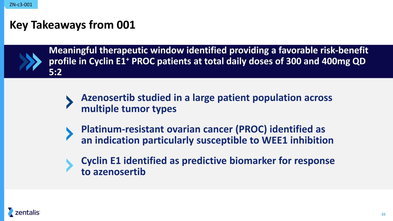 32 Clinical Activity Overview - Total Daily Doses ≥ 300 mg - Continuous and Intermittent (N=193) Azenosertib Demonstrated Encouraging ORR and DOR at ≥300mg Total Daily Dose, Intermittent in PROC Tumor Type PROC USC Other Solid Tumors Dose Schedule Intermittent Continuous Intermittent Continuous Intermittent Continuous Cyclin E1 IHC Status All Cyclin E1+ All Cyclin E1+ All Cyclin E1+ All Cyclin E1+ All Cyclin E1+ All Cyclin E1+ Number of Patients 58 23 11 3 19 11 16 4 43 4 46 5 ORR, (%), n (95% CI) 20.7%, (12/58) (11.2 - 33.4) 34.8%, (8/23) (16.4 - 57.3) 18.8% (2/11) (2.3 - 51.8) 33.3% (1/3) (0.8 - 90.6) 26.3% (5/19) (9.2 - 51.2) 36.4% (4/11) (10.9 - 69.2) 18.8% (3/16) (4.1 - 45.7) 25.0% (1/4) (0.6 - 80.6) 2.3% (1/4) (0.1 - 12.3) 0.0% (0/4) (0.0 - 60.2) 4.3% (2/46) (0.5 - 14.8) 0.0% (0/5) (0.0 - 52.2) mDOR (mos) (95% CI) 5.1 (3.0, 5.9) 5.2 (2.8, 6.9) 7.1 (4.2, NE) 4.2 (NE, NE) 5.5 (5.4, NE) 5.5 (5.4, NE) 5.6 (4.1, NE) 6.9 (NE, NE) 4.3 (NE, NE) NA 3.3 (3.0, NE) NA ZN-c3-001 1 Not a head-to-head comparison PROC, platinum-resistant ovarian cancer; USC, uterine serous carcinoma; ORR, objective response rate; mDOR, median duration of response; IHC, immunohistochemistry; NE, not evaluable Greater anti-tumor activity seen with intermittent dosing schedule and Cyclin E1+ patients Results direct focused development on doses of 300 and 400 mg at intermittent dosing schedule Inter itt t All Cycli 58 20.7 , (12/58) (11.2 - 33.4) 34.8 , (8/23) (16.4 - 57.3) 5.1 (3.0, 5.9) 5.2 (2.8, 6.9) Data Cutoff Dec 2 2024 Active database; subject to further change