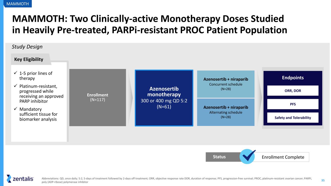 33 Key Takeaways from 001 Azenosertib studied in a large patient population across multiple tumor types Platinum-resistant ovarian cancer (PROC) identified as an indication particularly susceptible to WEE1 inhibition Cyclin E1 identified as predictive biomarker for response to azenosertib Meaningful therapeutic window identified providing a favorable risk-benefit profile in Cyclin E1+ PROC patients at total daily doses of 300 and 400mg QD 5:2 ZN-c3-001