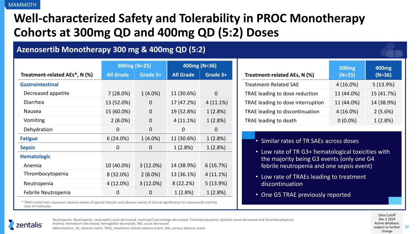 36 Heavily Pre-Treated PARPi-resistant PROC Population 300 mg 5:2 (N=25) 400 mg 5:2 (N=36) Age (years) Median 71.0 63.0 Range (Min-Max) 45 – 80 31 - 84 ECOG PS (n, %) ECOG 0 7 (28%) 16 (44%) ECOG 1 18 (72%) 20 (56%) Prior Lines of Treatment (n, %) 1-3 15 (60%) 20 (56%) ≥4 10 (40%) 16 (44%) PARP 25 (100%) 36 (100%) Bevacizumab 24 (96%) 34 (94%) Cyclin E1 Status (n, %) Positive 13 (52%) 16 (44%) Negative 10 (40%) 15 (42%) Unknown 2 (8%) 5 (14%) MAMMOTH Abbreviations: QD, once daily; 5:2, 5-days of treatment followed by 2-days off treatment; ORR, objective response rate DOR, duration of response; PFS, progression-free survival, PROC, platinum-resistant ovarian cancer Patient Demographics and Clinical Characteristics Monotherapy Cohorts Only Data Cutoff Dec 2 2024 Active database; subject to further change
