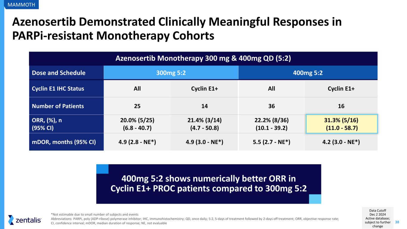 37 Well-characterized Safety and Tolerability in PROC Monotherapy Cohorts at 300mg QD and 400mg QD (5:2) Doses Neutropenia: Neutropenia, neutrophil count decreased, neutrophil percentage decreased; Thrombocytopenia: platelet count decreased and thrombocytopenia; Anemia: hematocrit decreased, hemoglobin decreased, RBC count decreased Abbreviations: AE, adverse event; TRAE, treatment related adverse event. SAE, serious adverse event. 300mg (N=25) 400mg (N=36) Treatment-related AEs*, N (%) All Grade Grade 3+ All Grade Grade 3+ Gastrointestinal Decreased appetite 7 (28.0%) 1 (4.0%) 11 (30.6%) 0 Diarrhea 13 (52.0%) 0 17 (47.2%) 4 (11.1%) Nausea 15 (60.0%) 0 19 (52.8%) 1 (2.8%) Vomiting 2 (8.0%) 0 4 (11.1%) 1 (2.8%) Dehydration 0 0 0 0 Fatigue 6 (24.0%) 1 (4.0%) 11 (30.6%) 1 (2.8%) Sepsis 0 0 1 (2.8%) 1 (2.8%) Hematologic Anemia 10 (40.0%) 3 (12.0%) 14 (38.9%) 6 (16.7%) Thrombocytopenia 8 (32.0%) 2 (8.0%) 13 (36.1%) 4 (11.1%) Neutropenia 4 (12.0%) 3 (12.0%) 8 (22.2%) 5 (13.9%) Febrile Neutropenia 0 0 1 (2.8%) 1 (2.8%) Azenosertib Monotherapy 300 mg & 400mg QD (5:2) Treatment-related AEs, N (%) 300mg (N=25) 400mg (N=36) Treatment-Related SAE 4 (16.0%) 5 (13.9%) TRAE leading to dose reduction 11 (44.0%) 15 (41.7%) TRAE leading to dose interruption 11 (44.0%) 14 (38.9%) TRAE leading to discontinuation 4 (16.0%) 2 (5.6%) TRAE leading to death 0 (0.0%) 1 (2.8%) • Similar rates of TR SAEs across doses • Low rate of TR G3+ hematological toxicities with the majority being G3 events (only one G4 febrile neutropenia and one sepsis event) • Low rate of TRAEs leading to treatment discontinuation • One G5 TRAE previously reported * TRAEs listed here represent adverse events of special interest and adverse events of clinical significance for azenosertib and this class of molecules MAMMOTH Data Cutoff Dec 2 2024 Active database; subject to further change