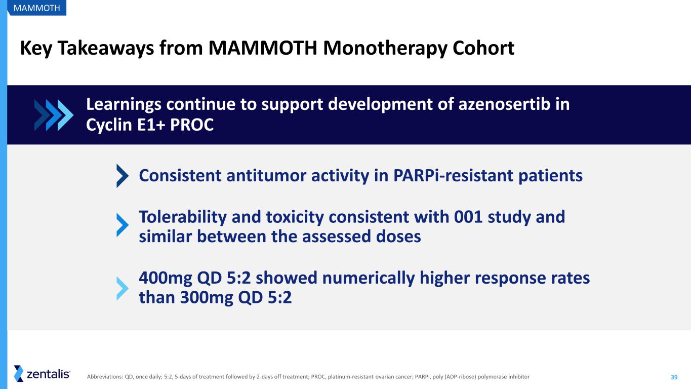 38 Azenosertib Monotherapy 300 mg & 400mg QD (5:2) Azenosertib Demonstrated Clinically Meaningful Responses in PARPi-resistant Monotherapy Cohorts Dose and Schedule 300mg 5:2 400mg 5:2 Cyclin E1 IHC Status All Cyclin E1+ All Cyclin E1+ Number of Patients 25 14 36 16 ORR, (%), n (95% CI) 20.0% (5/25) (6.8 - 40.7) 21.4% (3/14) (4.7 - 50.8) 22.2% (8/36) (10.1 - 39.2) 31.3% (5/16) (11.0 - 58.7) mDOR, months (95% CI) 4.9 (2.8 - NE*) 4.9 (3.0 - NE*) 5.5 (2.7 - NE*) 4.2 (3.0 - NE*) 400mg 5:2 shows numerically better ORR in Cyclin E1+ PROC patients compared to 300mg 5:2 *Not estimable due to small number of subjects and events Abbreviations: PARPi, poly (ADP-ribose) polymerase inhibitor; IHC, immunohistochemistry; QD, once daily; 5:2, 5-days of treatment followed by 2-days off treatment; ORR, objective response rate; CI, confidence interval; mDOR, median duration of response; NE, not evaluable MAMMOTH Data Cutoff Dec 2 2024 Active database; subject to further change